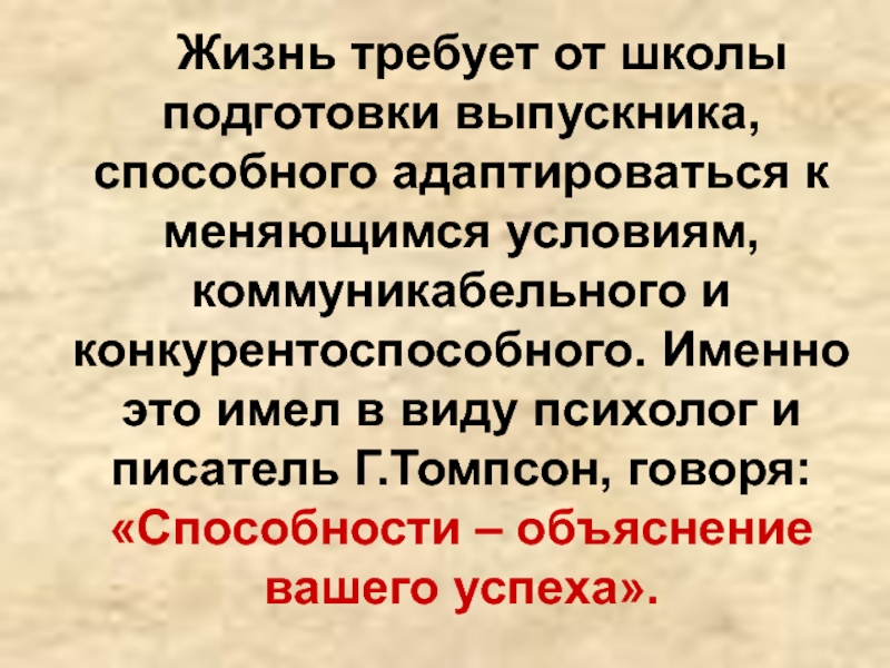 адаптироваться к меняющимся условиям, коммуникабельного и конкурентоспособного. Именно это имел в виду психолог и писатель Г.Томпсон, говоря: «Способности – объяснение вашего успеха».