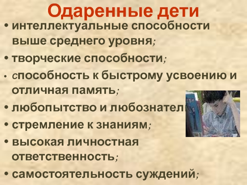 патологии головного мозга, одарены от природы; задача педагога состоит в том, чтобы как можно раньше увидеть этот дар и развить его.