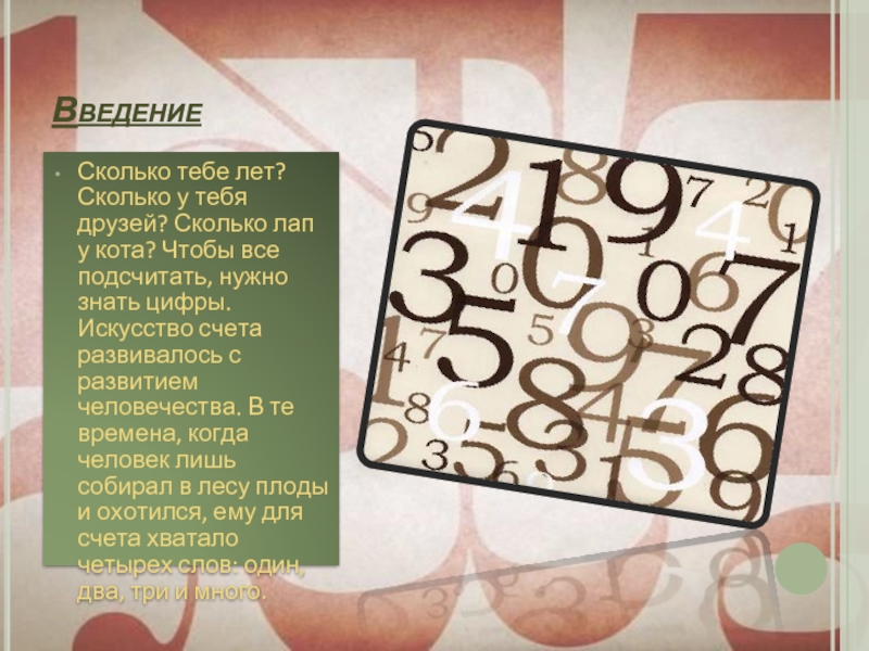 Чтобы все подсчитать, нужно знать цифры. Искусство счета развивалось с развитием человечества. В те времена, когда человек лишь собирал в лесу плоды и охотился, ему для счета хватало четырех слов: один, два, три и много.