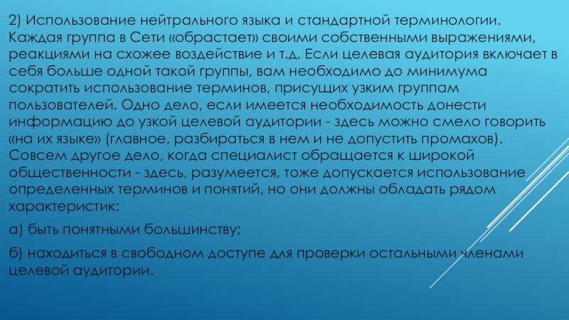 «обрастает» своими собственными выражениями, реакциями на схожее воздействие и т.д. Если целевая аудитория включает в себя больше одной такой группы, вам необходимо до минимума сократить использование терминов, присущих узким группам пользователей. Одно дело, если имеется необходимость донести информацию до узкой целевой аудитории - здесь можно смело говорить «на их языке» (главное, разбираться в нем и не допустить промахов). Совсем другое дело, когда специалист обращается к широкой общественности - здесь, разумеется, тоже допускается использование определенных терминов и понятий, но они должны обладать рядом характеристик:
