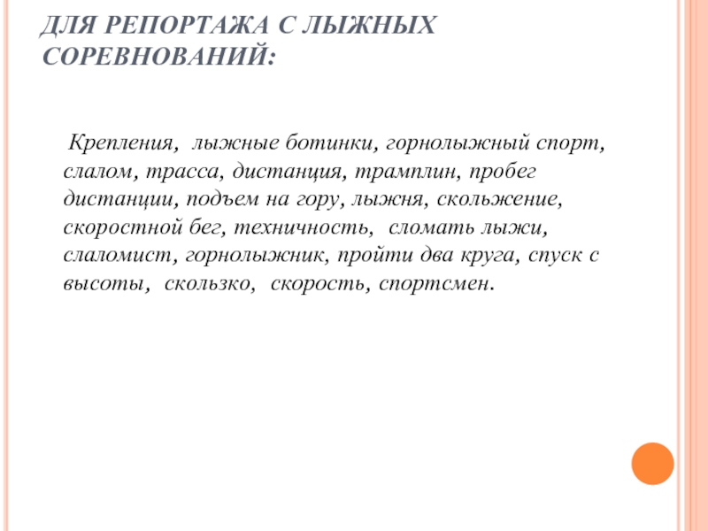Слайд 16ДЛЯ РЕПОРТАЖА С ЛЫЖНЫХ СОРЕВНОВАНИЙ: