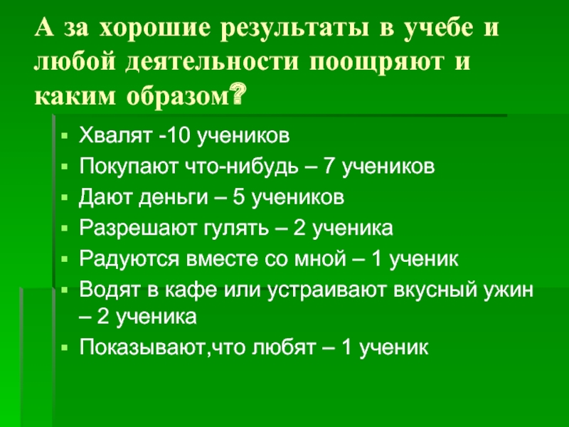 Слайд 10А за хорошие результаты в учебе и любой деятельности поощряют и