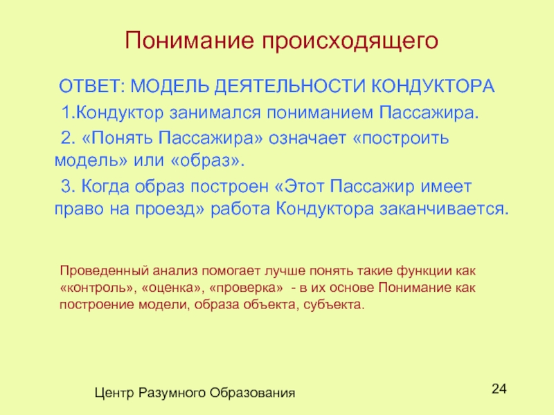 Проведенный анализ помогает лучше понять такие функции как «контроль», «оценка», «проверка» - в их основе Понимание как построение модели, образа объекта, субъекта.