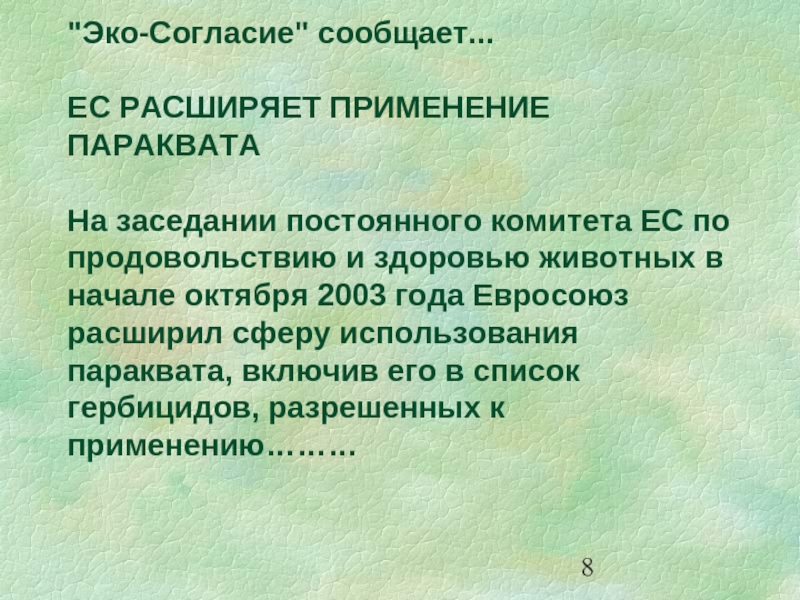 и здоровью животных в начале октября 2003 года Евросоюз расширил сферу использования параквата, включив его в список гербицидов, разрешенных к применению………
