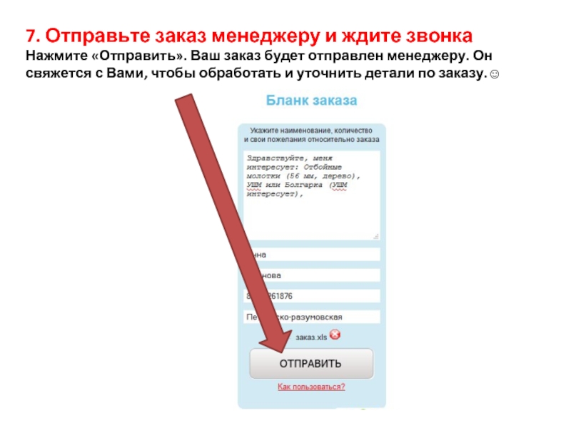 Слайд 87. Отправьте заказ менеджеру и ждите звонка Нажмите «Отправить». Ваш заказ будет