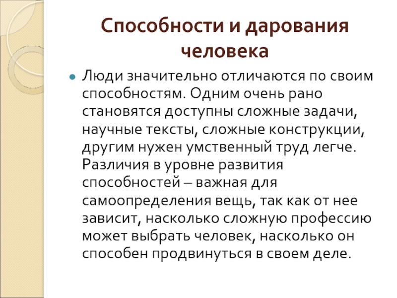 рано становятся доступны сложные задачи, научные тексты, сложные конструкции, другим нужен умственный труд легче. Различия в уровне развития способностей – важная для самоопределения вещь, так как от нее зависит, насколько сложную профессию может выбрать человек, насколько он способен продвинуться в своем деле.