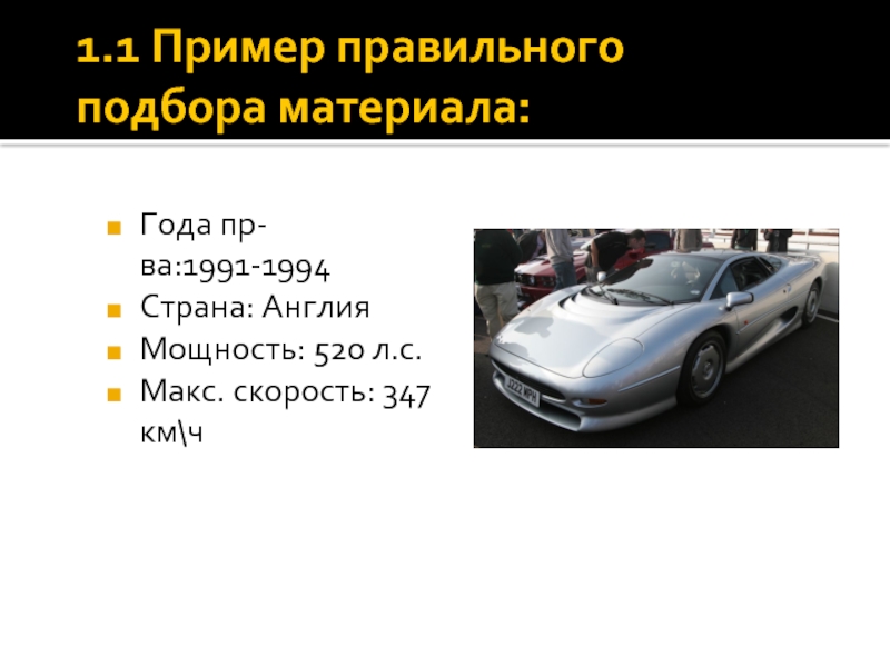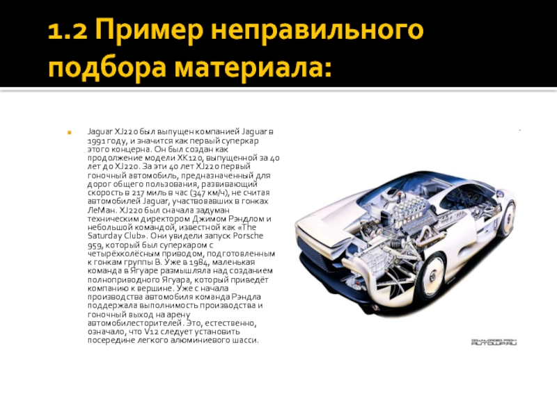 1991 году, и значится как первый суперкар этого концерна. Он был создан как продолжение модели XK120, выпущенной за 40 лет до XJ220. За эти 40 лет XJ220 первый гоночный автомобиль, предназначенный для дорог общего пользования, развивающий скорость в 217 миль в час (347 км/ч), не считая автомобилей Jaguar, участвовавших в гонках ЛеМан. XJ220 был сначала задуман техническим директором Джимом Рэндлом и небольшой командой, известной как «The Saturday Club». Они увидели запуск Porsche 959, который был суперкаром с четырёхколёсным приводом, подготовленным к гонкам группы В. Уже в 1984, маленькая команда в Ягуаре размышляла над созданием полноприводного Ягуара, который приведёт компанию к вершине. Уже с начала производства автомобиля команда Рэндла поддержала выполнимость производства и гоночный выход на арену автомобилесторителей. Это, естественно, означало, что V12 следует установить посередине легкого алюминиевого шасси.