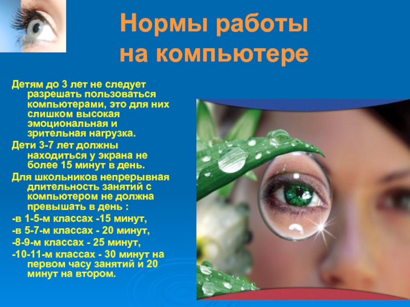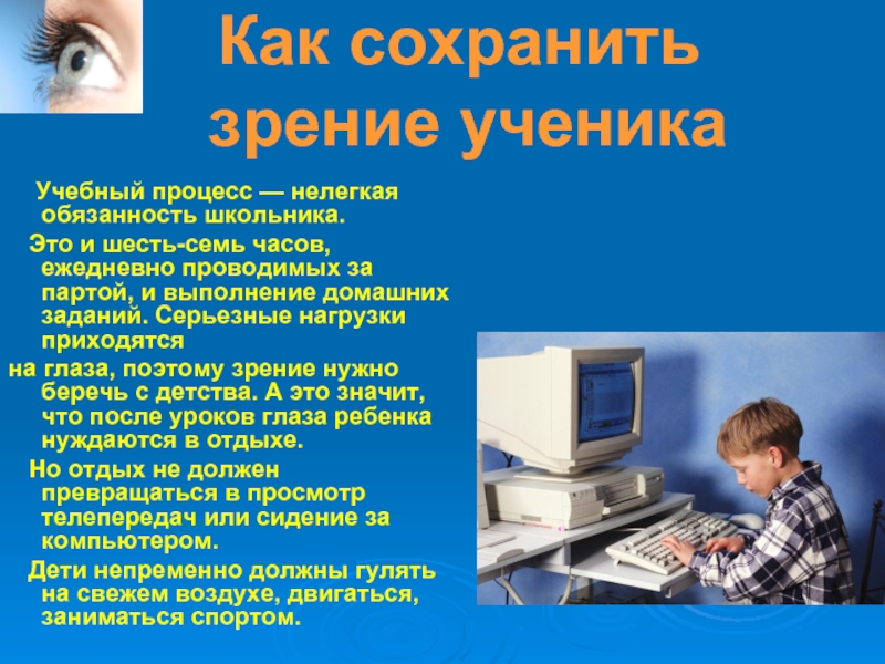 В последнее время люди стали намного больше работать за компьютером, огромная нагрузка ложится на глаза школьника и при обучении.