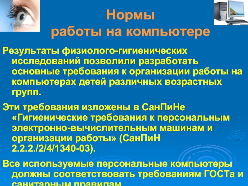 Эти требования изложены в СанПиНе «Гигиенические требования к персональным электронно-вычислительным машинам и организации работы» (СанПиН 2.2.2./2/4/1340-03).