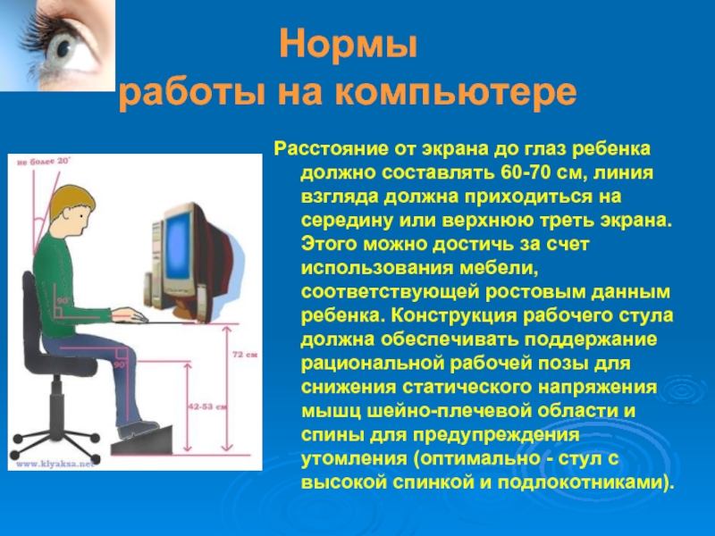 60-70 см, линия взгляда должна приходиться на середину или верхнюю треть экрана. Этого можно достичь за счет использования мебели, соответствующей ростовым данным ребенка. Конструкция рабочего стула должна обеспечивать поддержание рациональной рабочей позы для снижения статического напряжения мышц шейно-плечевой области и спины для предупреждения утомления (оптимально - стул с высокой спинкой и подлокотниками).