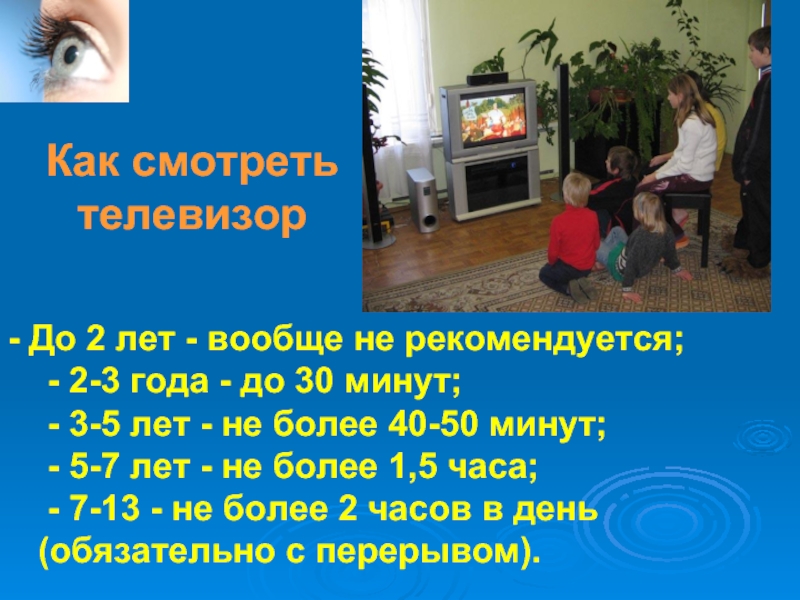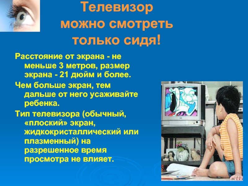 Тип телевизора (обычный, «плоский» экран, жидкокристаллический или плазменный) на разрешенное время просмотра не влияет.