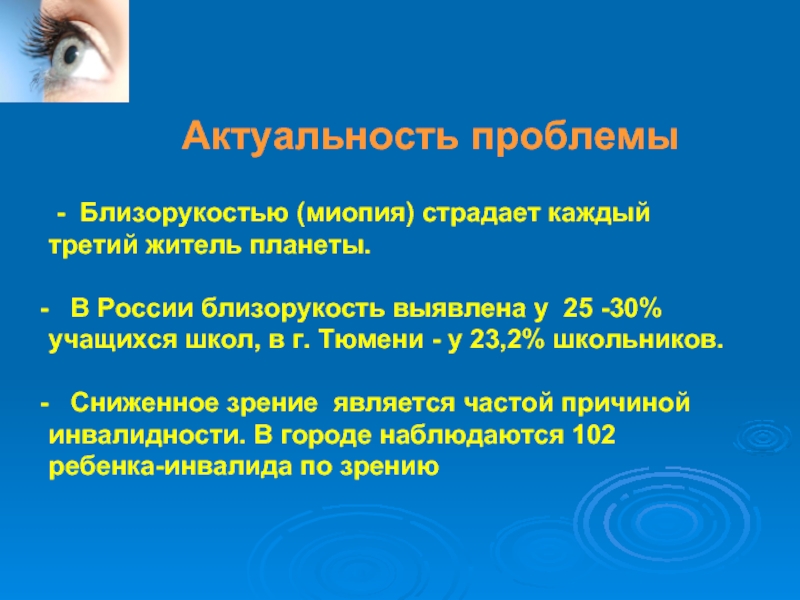 В России близорукость выявлена у 25 -30% учащихся школ, в г. Тюмени - у 23,2% школьников.