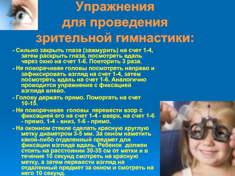 - Голову держать прямо. Поморгать на счет 10-15.