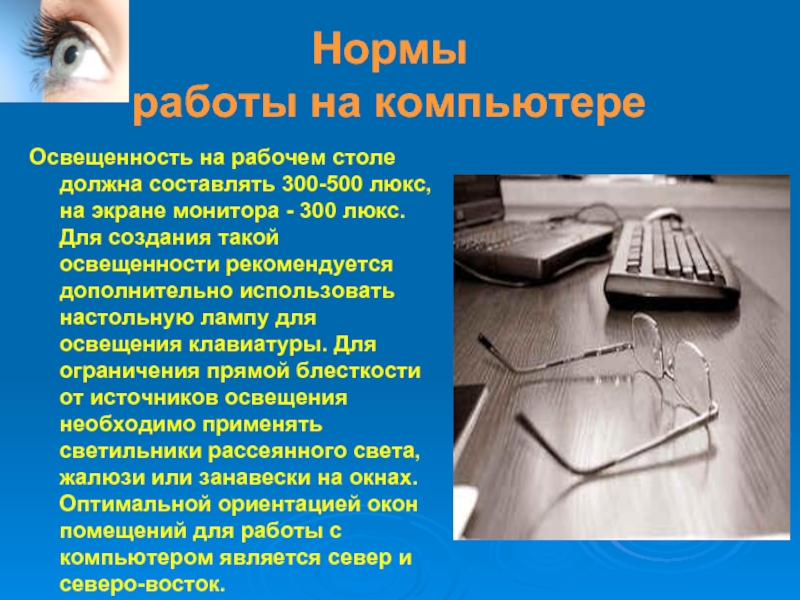Освещенность на рабочем столе должна составлять 300-500 люкс,