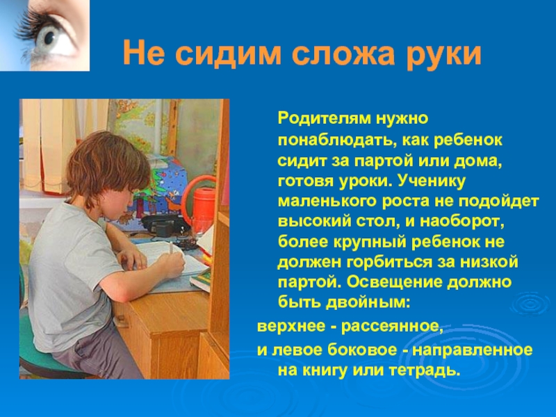 на глаза, поэтому зрение нужно беречь с детства. А это значит, что после уроков глаза ребенка нуждаются в отдыхе.