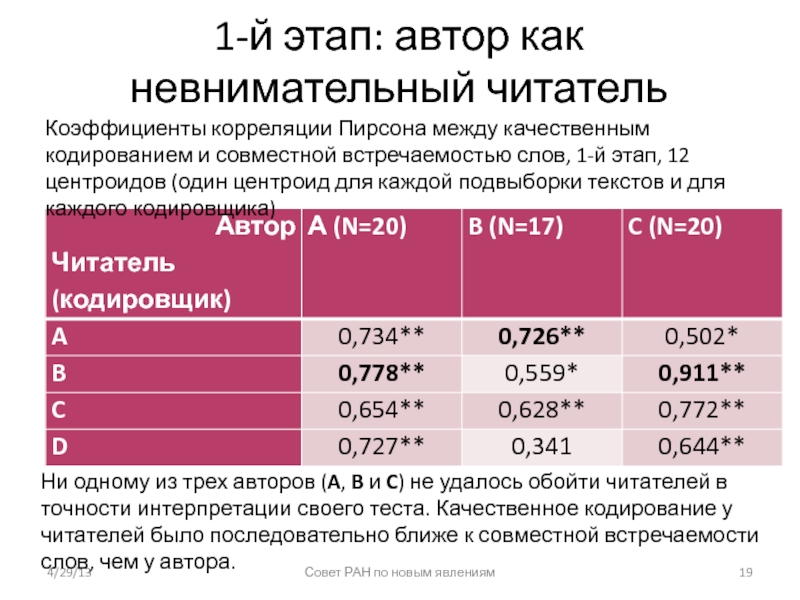 Коэффициенты корреляции Пирсона между качественным кодированием и совместной встречаемостью слов, 1-й этап, 12 центроидов (один центроид для каждой подвыборки текстов и для каждого кодировщика)
