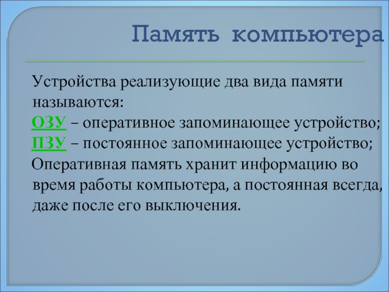 ОЗУ - хранит все программы и данные, необходимые для работы компьютера. Процессор мгновенно может обратится к информации, хранящейся в оперативной памяти. После отключения источника питания вся информация теряется.
