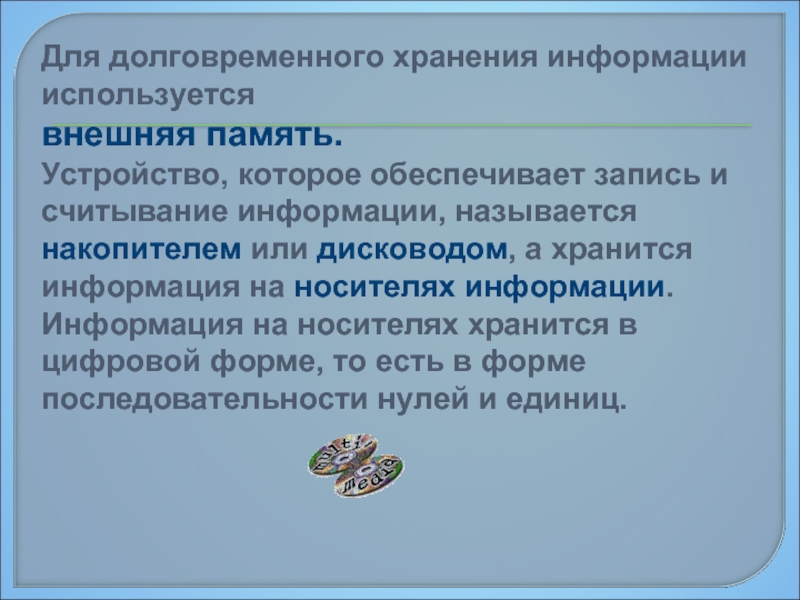 считывание информации, называется накопителем или дисководом, а хранится информация на носителях информации. Информация на носителях хранится в цифровой форме, то есть в форме последовательности нулей и единиц.