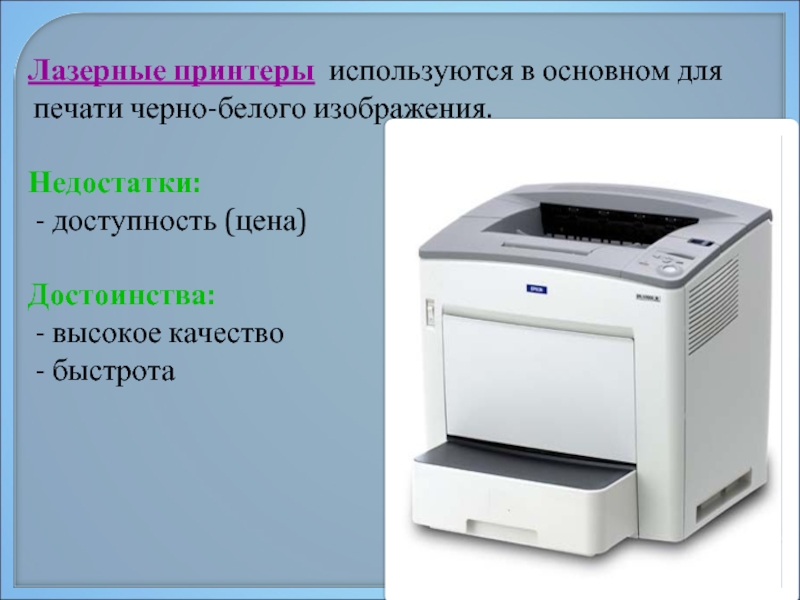 Слайд 23  Лазерные принтеры используются в основном для печати черно-белого изображения.