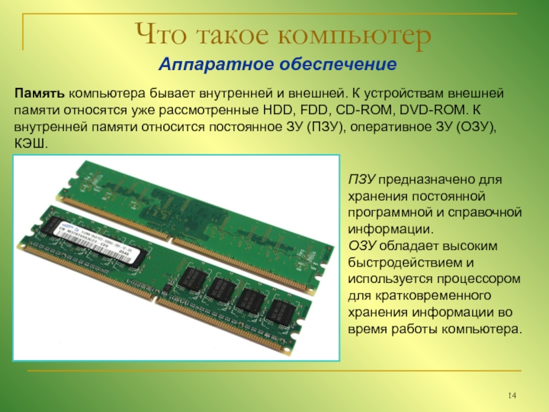 устройствам внешней памяти относятся уже рассмотренные HDD, FDD, CD-ROM, DVD-ROM. К внутренней памяти относится постоянное ЗУ (ПЗУ), оперативное ЗУ (ОЗУ), КЭШ.