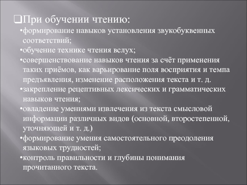 формирование рецептивных грамматических навыков чтения и аудирования;