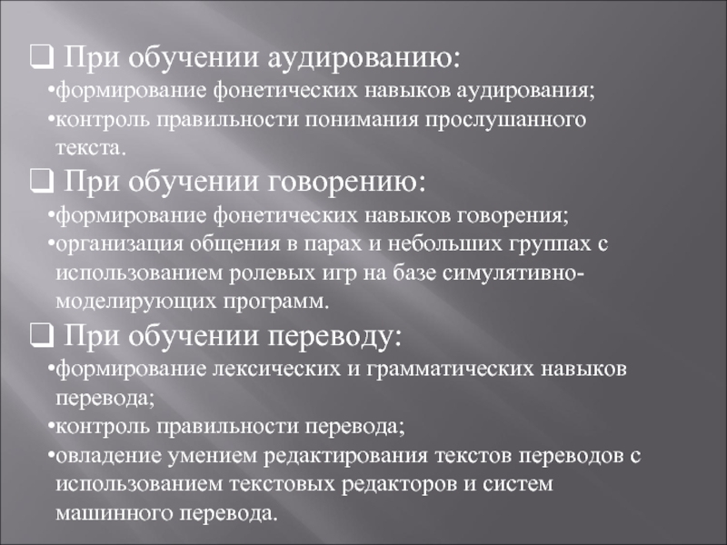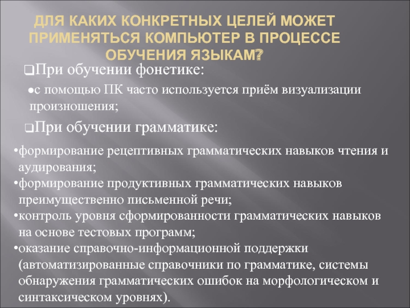оказание справочно-информационной поддержки (автоматизированные справочники по грамматике, системы обнаружения грамматических ошибок на морфологическом и синтаксическом уровнях).