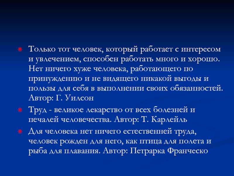 Для человека нет ничего естественней труда, человек рожден для него, как птица для полета и рыба для плавания. Автор: Петрарка Франческо