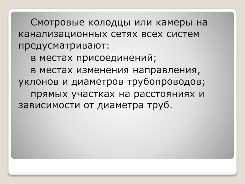 Слайд 16Смотровые колодцы или камеры на канализационных сетях всех систем предусматривают: