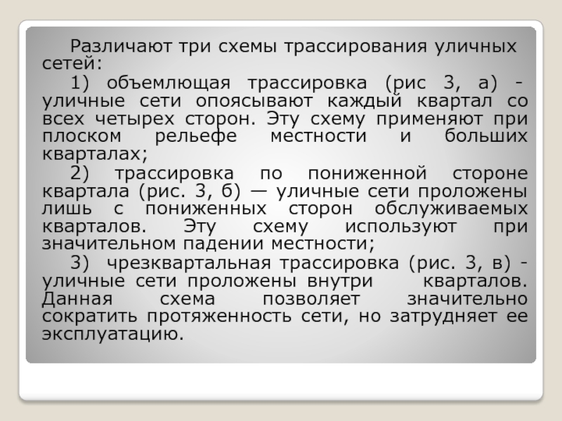 2) трассировка по пониженной стороне квартала (рис. 3, б) — уличные сети проложены лишь с пониженных сторон обслуживаемых кварталов. Эту схему используют при значительном падении местности;