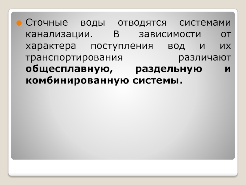 Слайд 26Сточные воды отводятся системами канализации. В зависимости от характера поступления вод