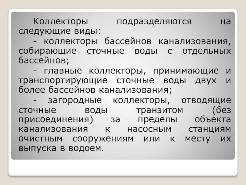 - коллекторы бассейнов канализования, собирающие сточные воды