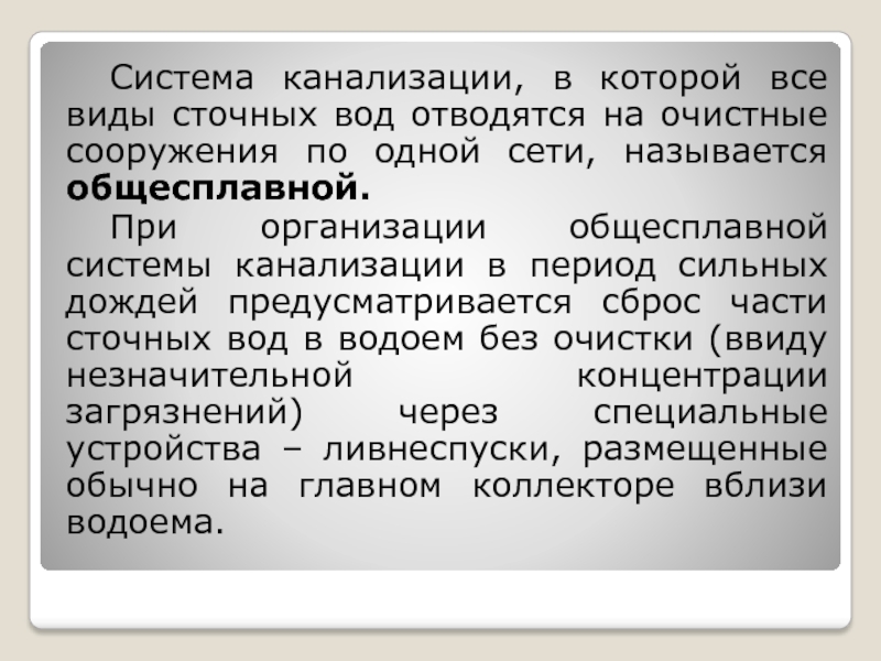 Слайд 27Система канализации, в которой все виды сточных вод отводятся на очистные