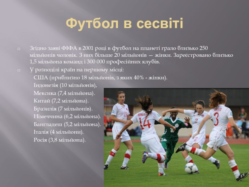 на планеті грало близько 250 мільйонів чоловік. З них більше 20 мільйонів — жінки. Зареєстровано близько 1,5 мільйона команд і 300 000 професійних клубів.