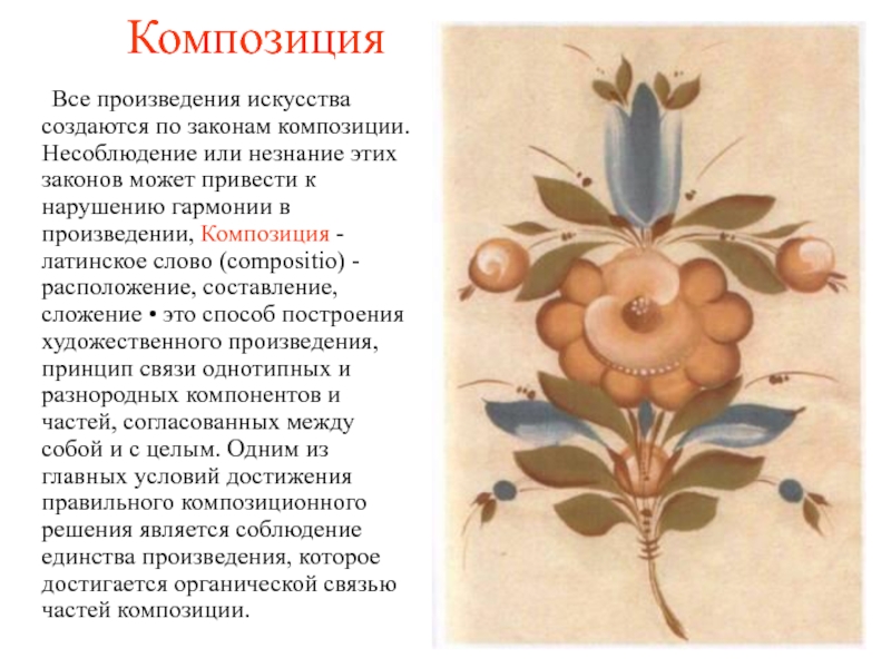 Несоблюдение или незнание этих законов может привести к нарушению гармонии в произведении, Композиция - латинское слово (compositio) - расположение, составление, сложение • это способ построения художественного произведения, принцип связи однотипных и разнородных компонентов и частей, согласованных между собой и с целым. Одним из главных условий достижения правильного композиционного решения является соблюдение единства произведения, которое достигается органической связью частей композиции.