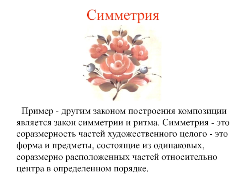 симметрии и ритма. Симметрия - это соразмерность частей художественного целого - это форма и предметы, состоящие из одинаковых, соразмерно расположенных частей относительно центра в определенном порядке.