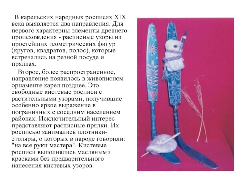 Второе, более распространенное, направление появилось в живописном орнаменте карел позднее. Это свободные кистевые росписи с растительными узорами, получившие особенно яркое выражение в пограничных с соседним населением районах. Исключительный интерес представляют расписные прялки. Их росписью занимались плотники-столяры, о которых в народе говорили: "на все руки мастера". Кистевые росписи выполнялись масляными красками без предварительного нанесения кистевых узоров.