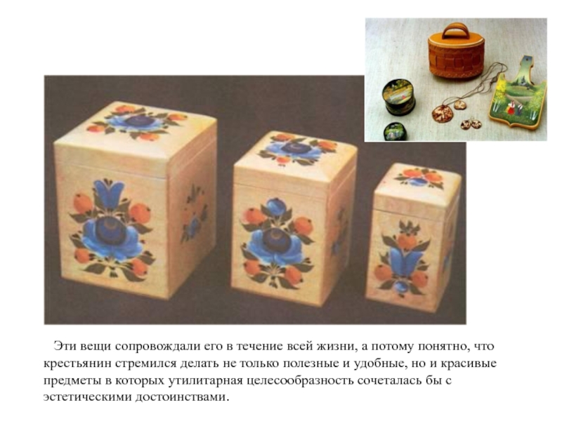 всей жизни, а потому понятно, что крестьянин стремился делать не только полезные и удобные, но и красивые предметы в которых утилитарная целесообразность сочеталась бы с эстетическими достоинствами.
