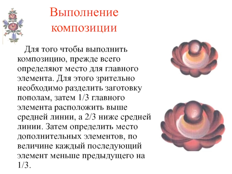 всего определяют место для главного элемента. Для этого зрительно необходимо разделить заготовку пополам, затем 1/3 главного элемента расположить выше средней линии, а 2/3 ниже средней линии. Затем определить место дополнительных элементов, по величине каждый последующий элемент меньше предыдущего на 1/3.