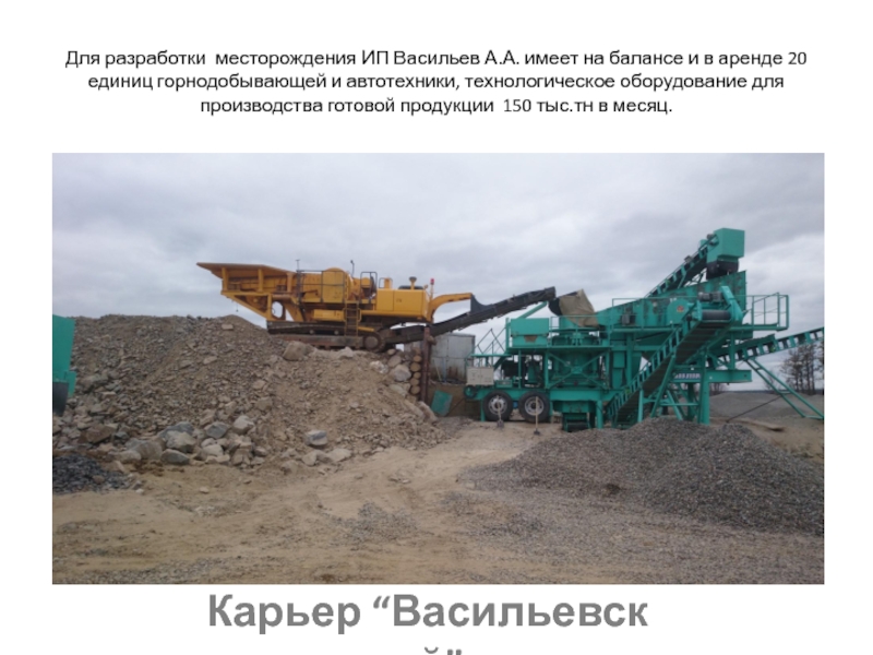 аренде 20 единиц горнодобывающей и автотехники, технологическое оборудование для производства готовой продукции 150 тыс.тн в месяц.