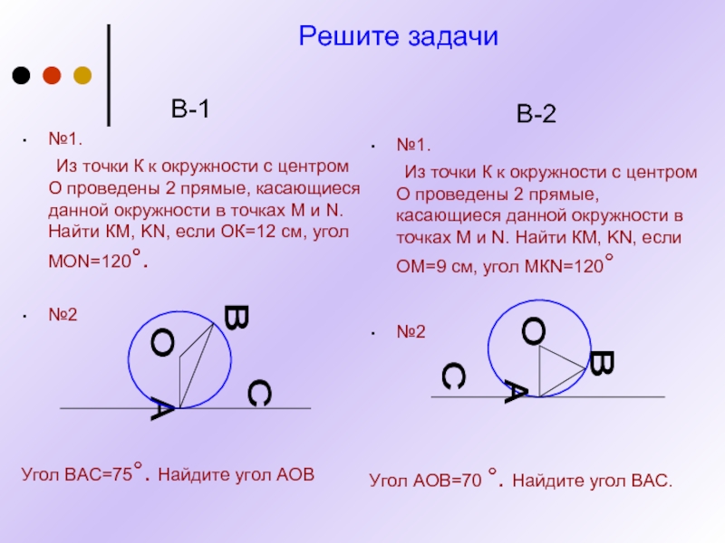Из точки К к окружности с центром О проведены 2 прямые, касающиеся данной окружности в точках М и N. Найти КМ, KN, если ОМ=9 см, угол МКN=120°