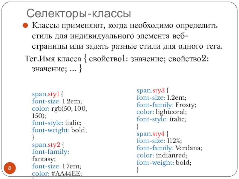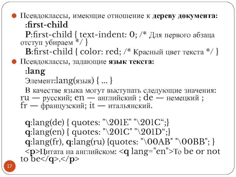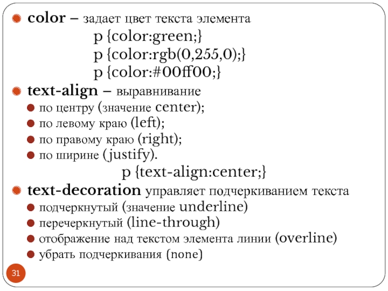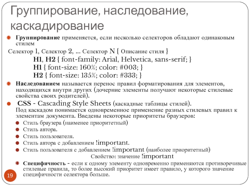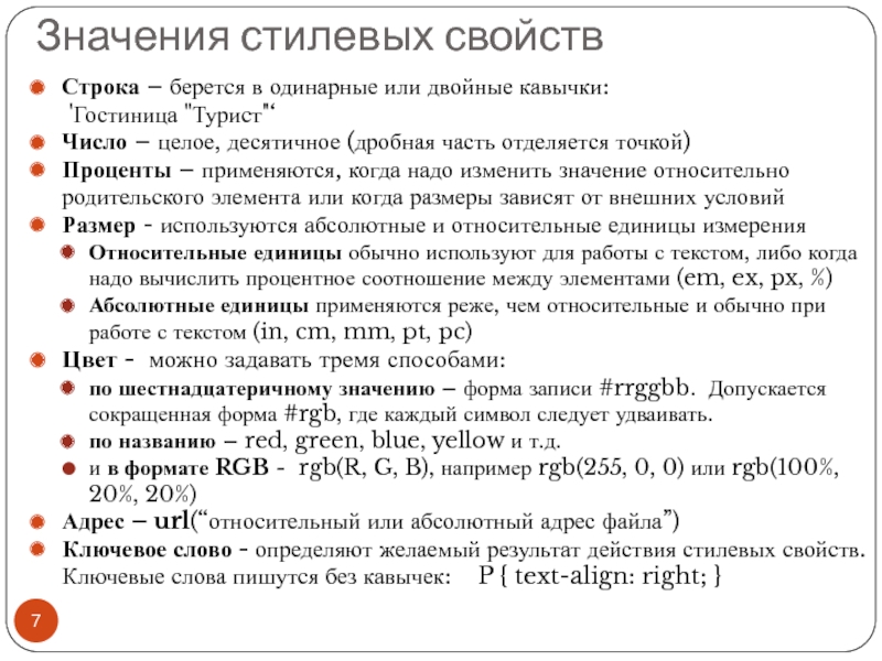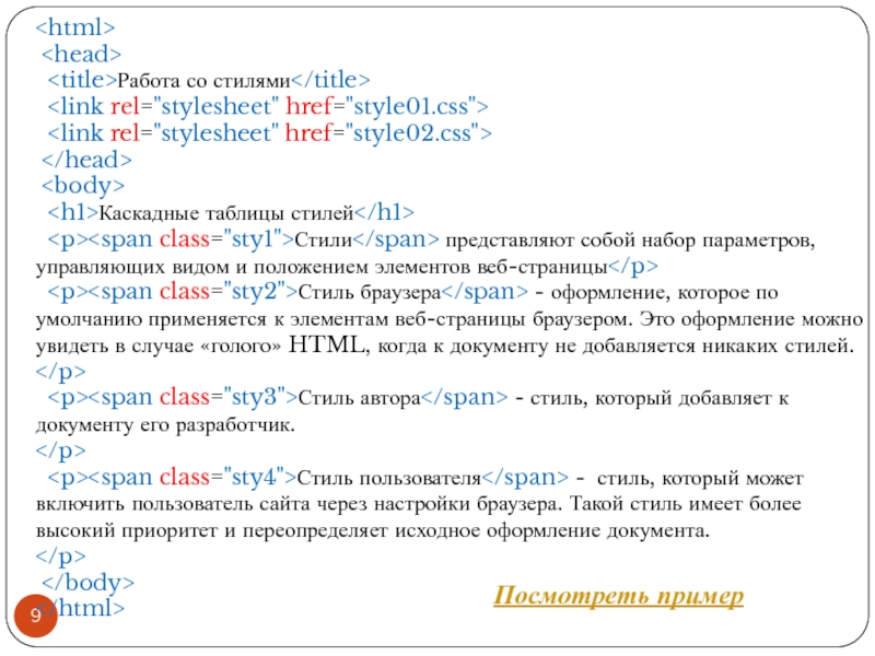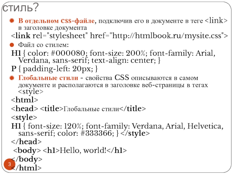 Файл со стилем: H1 { color: #000080; font-size: 200%; font-family: Arial, Verdana, sans-serif; text-align: center; } P { padding-left: 20px; } Глобальные стили - свойства CSS описываются в самом документе и располагаются в заголовке веб-страницы в тегах