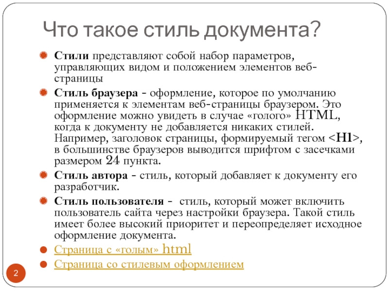 положением элементов веб-страницы Стиль браузера - оформление, которое по умолчанию применяется к элементам веб-страницы браузером. Это оформление можно увидеть в случае «голого» HTML, когда к документу не добавляется никаких стилей. Например, заголовок страницы, формируемый тегом
