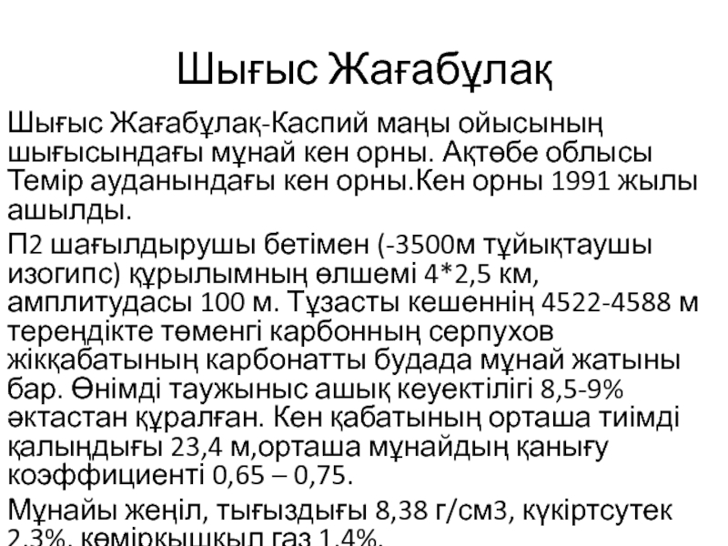 Шығыс Жағабұлақ-Каспий маңы ойысының шығысындағы мұнай кен орны. Ақтөбе облысы