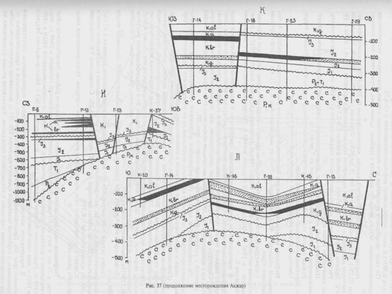 Кешендер сулы тіректі жарылымдармен беріліп, сазды таужыныстар қабаты 300 м дейін барады.