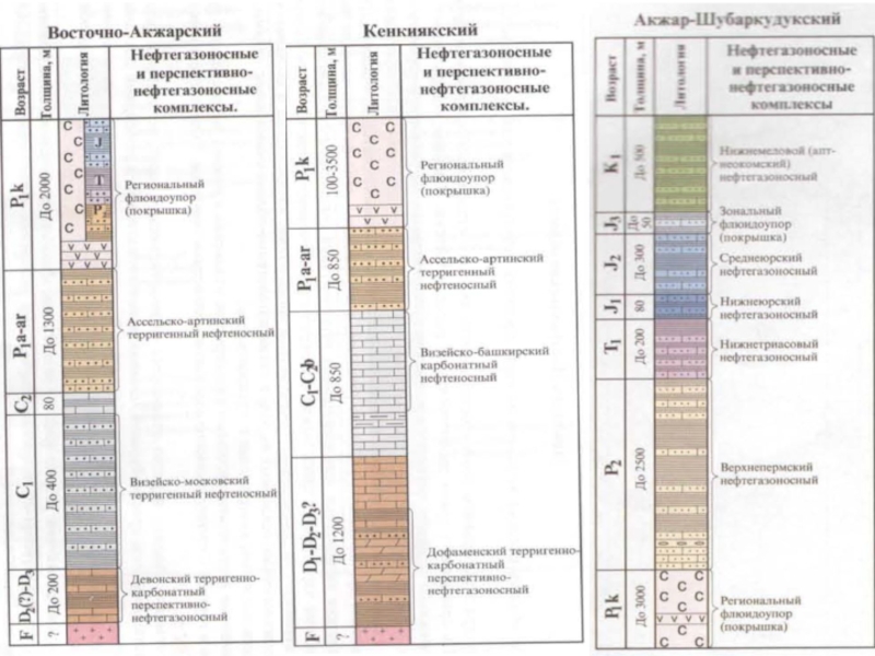 Кен орындағы құмтас, алевролит, саздан құралған өнімді қима 200-2650 м тереңдікті қамтиды. Жатындар тұтқыш типі бойынша күмбездік,тектоникалық ,литологиялық шектелген. Мұнай шоғырлары коллектор типі бойынша қабаттық, дөңес және тектоникалық болып ажыратылады. Олардың қалыңдығы 300 м-ге жетеді. Өнімді горизонт қалыңдығы 8-78м, тиімдісі 2-54,1м,мұнайға қаныққан қалыңдық 1,5-39,9м.Коллекторлардың кеуектілігі 15-354,8%, өткізгіштігі 0,001-3,64 мкм2. Мұнайға қанығу коэффициенті 0,56-0,75. Ең ауыр мұнай (тығыздығы 0,92-0,97 г/см3) төменгі бор түзілімдерінде анықталған. Тығыздығы 0,852-0,862 г/см3 жеңіл мұнайлар жоғарғы пермь және төменгі триас қималарына сәйкес.