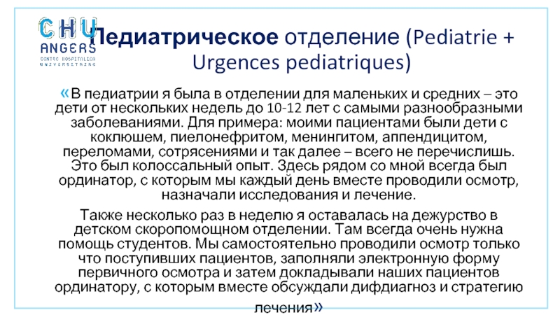 Также несколько раз в неделю я оставалась на дежурство в детском скоропомощном отделении. Там всегда очень нужна помощь студентов. Мы самостоятельно проводили осмотр только что поступивших пациентов, заполняли электронную форму первичного осмотра и затем докладывали наших пациентов ординатору, с которым вместе обсуждали дифдиагноз и стратегию лечения»