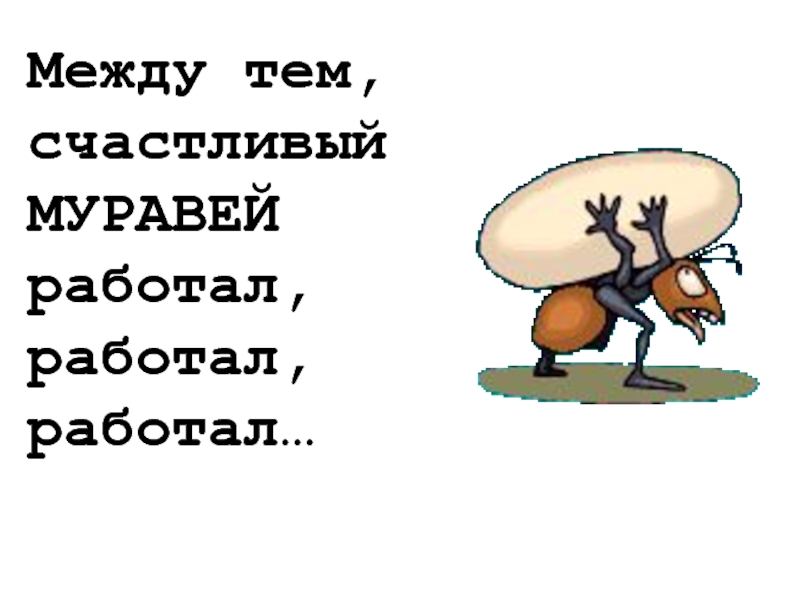Слайд 8Между тем, счастливый МУРАВЕЙ работал, работал, работал…