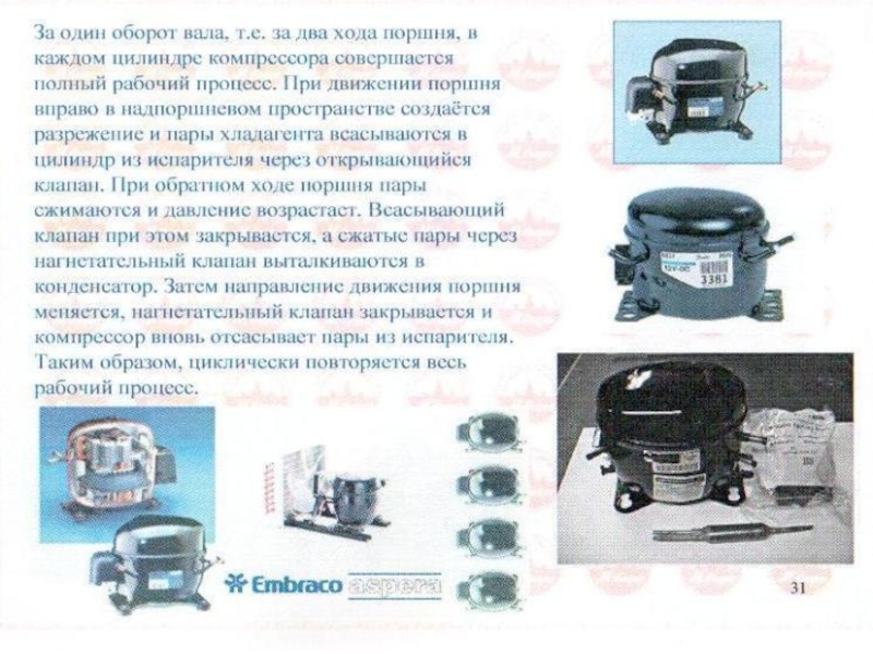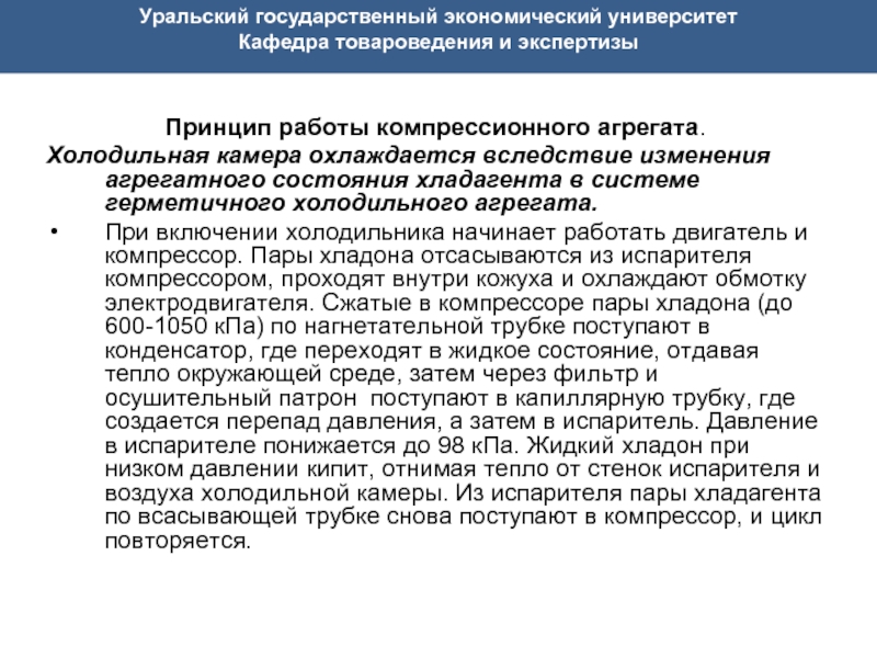При включении холодильника начинает работать двигатель и компрессор. Пары хладона отсасываются из испарителя компрессором, проходят внутри кожуха и охлаждают обмотку электродвигателя. Сжатые в компрессоре пары хладона (до 600-1050 кПа) по нагнетательной трубке поступают в конденсатор, где переходят в жидкое состояние, отдавая тепло окружающей среде, затем через фильтр и осушительный патрон поступают в капиллярную трубку, где создается перепад давления, а затем в испаритель. Давление в испарителе понижается до 98 кПа. Жидкий хладон при низком давлении кипит, отнимая тепло от стенок испарителя и воздуха холодильной камеры. Из испарителя пары хладагента по всасывающей трубке снова поступают в компрессор, и цикл повторяется.