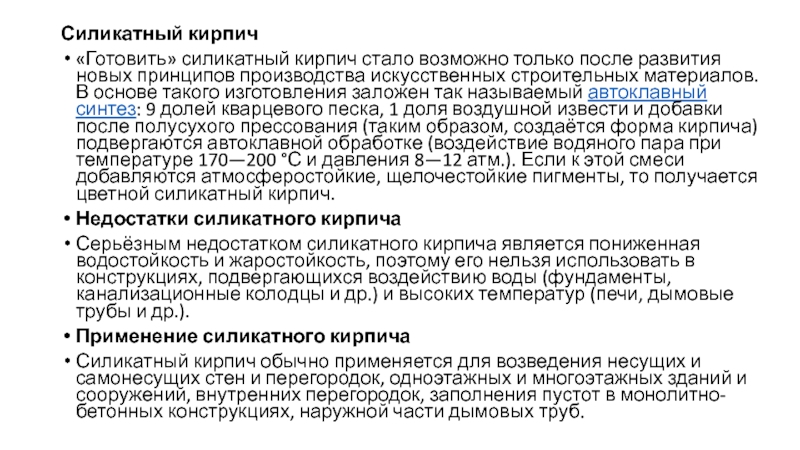 Серьёзным недостатком силикатного кирпича является пониженная водостойкость и жаростойкость, поэтому его нельзя использовать в конструкциях, подвергающихся воздействию воды (фундаменты, канализационные колодцы и др.) и высоких температур (печи, дымовые трубы и др.).