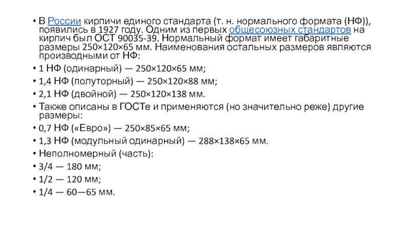 Одним из первых общесоюзных стандартов на кирпич был ОСТ 90035-39. Нормальный формат имеет габаритные размеры 250×120×65 мм. Наименования остальных размеров являются производными от НФ: